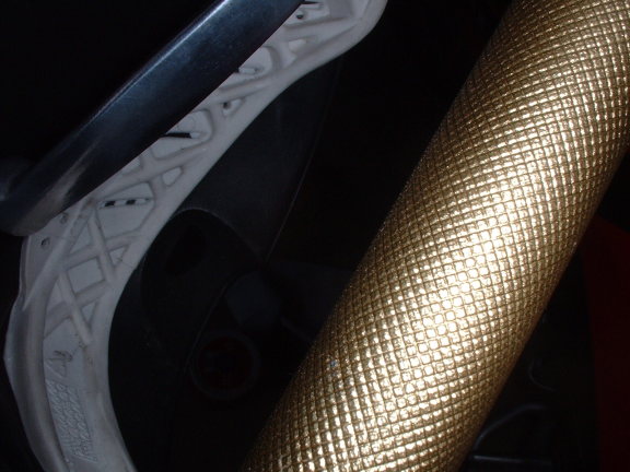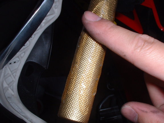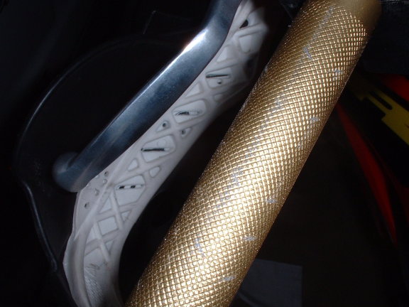 イボイボっついーかツルツルっつーか、微妙な表面で、グリップボンドがあっさり剥がれてしまった。ちなみにこの写真はグリップを取り外した直後。きれーに糊が剥がれちゃってます。こいつはいただけない・・・ |
