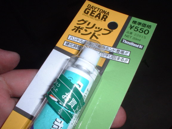 DAYTONAのグリップボンドを使用します。普通の家庭用ボンドと違い、ゴム系?のボンドは空気に触れない部分でも硬化してくれるそうな。