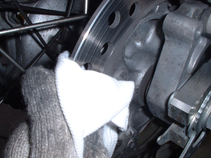 ウエスにたっぷりのグリースブレーキクリーナーをスプレーし、後輪を回転させながらディスクを挟み込みます。