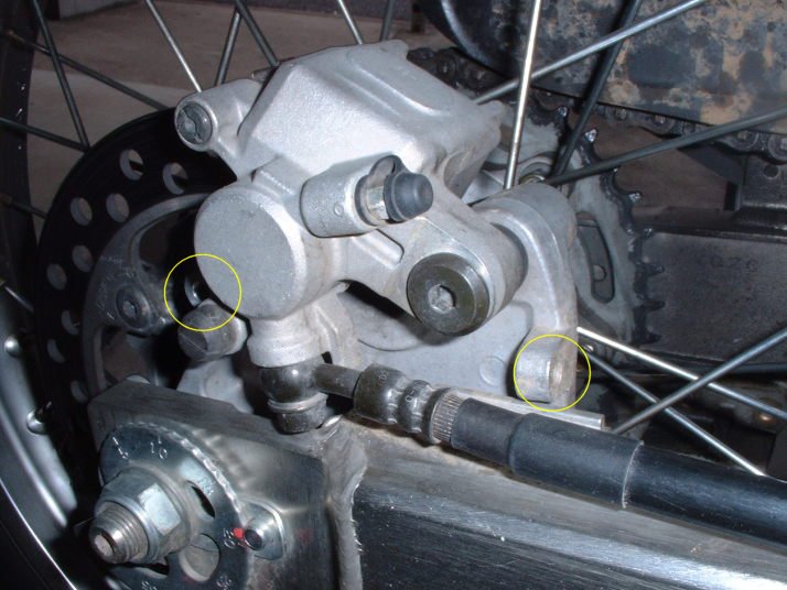 リアキャリパーを見ると黄丸の部分にネジ穴が見当たりますね。