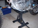 まずは車体を持ちあげましょう。フロントフォークをはずすので、これができなくては話は始まりませぬ。