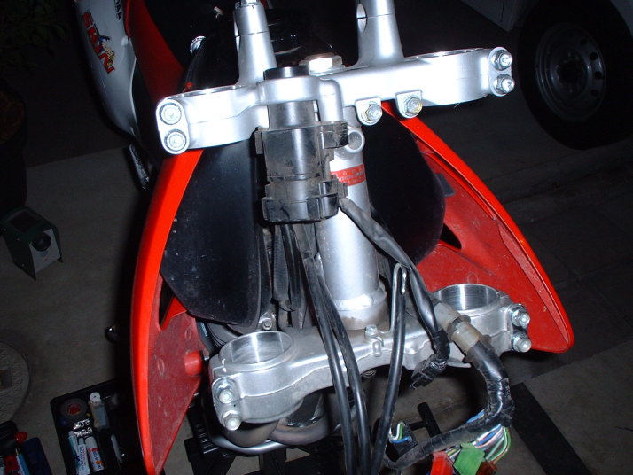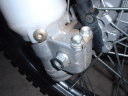 あ、そうそう。写真ではすでにハンドル部分が外れてますが、ブレーキのマスターシリンダを取り外したあとの保管方法は注意しましょうネ。間違ってもハンドルに取り付いてる状態から上下反対にはしないでね。あと、外したらブレーキレバーをいじらないでね。 |