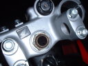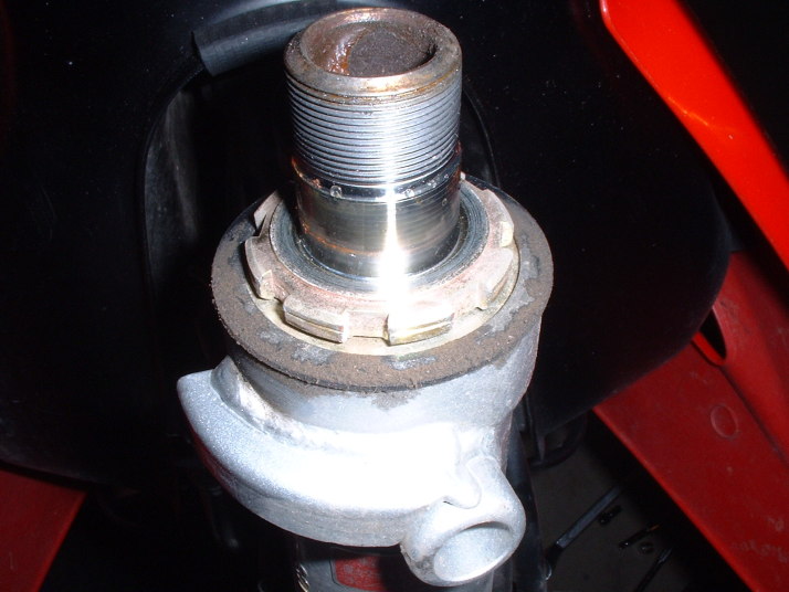 で、コンニチハしたのがなんつーんだろ?これ。なんか良くわかんないけど、フックレンチという、いかにも引っ掛けそうな名前のレンチで外してあげます。このナットが外れると、ステム部分が下に外れるので、落とさないように気をつけてくださいね。ポロっといってしまったら泣くに泣けません。 |