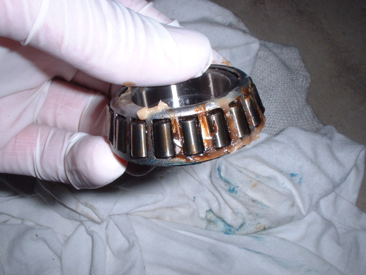 ベアリング部には、思い切り塗りこんじゃいます。とある雑誌に言わせると、古いグリスを押し出すようにいっぱいいっぱい塗りこみます。だそうです。 |