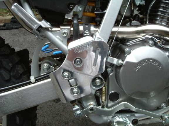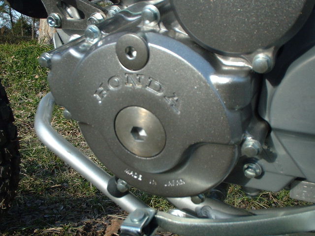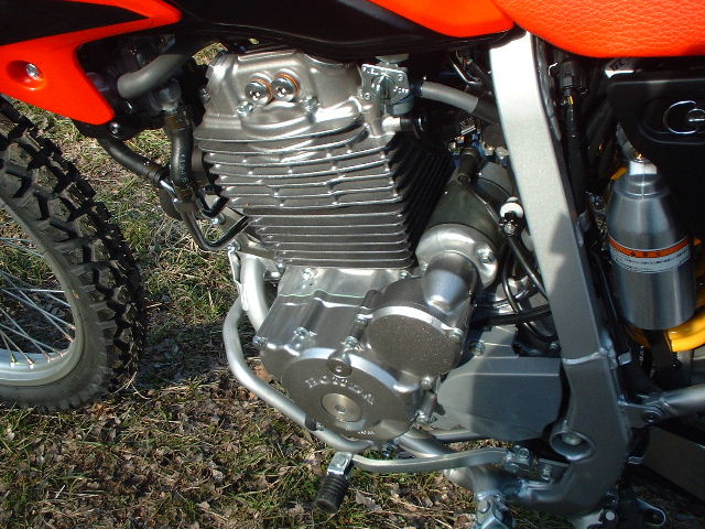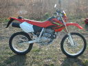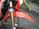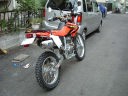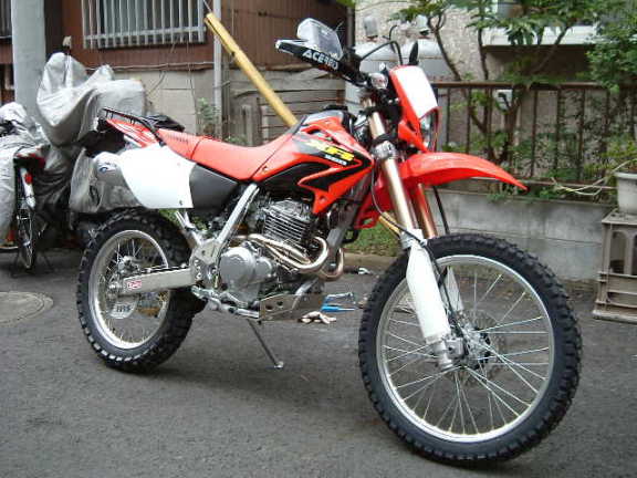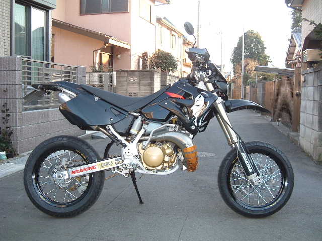 CRM250ARかな?ヤフオクで購入したモタードキット搭載の超豪華カスタムマシンです。黒の中で光を放つパーツが美しいです。よ、よだれが・・・ |