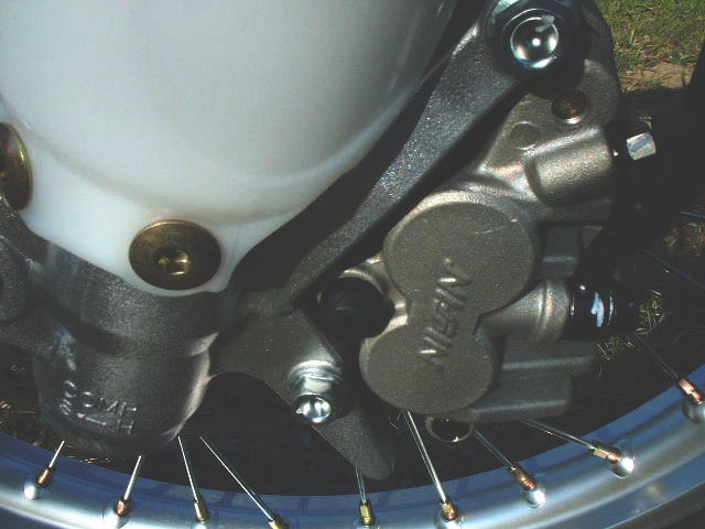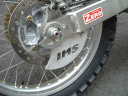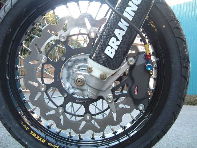 これぞモタードの証!BRAKINGのウェーブディスク(大径)何ちゅーサイズだ。ここまでやってこそ本物のモタードです。他車のキャストホイールを移植する位じゃだめなんです!お金をかけるんです! |